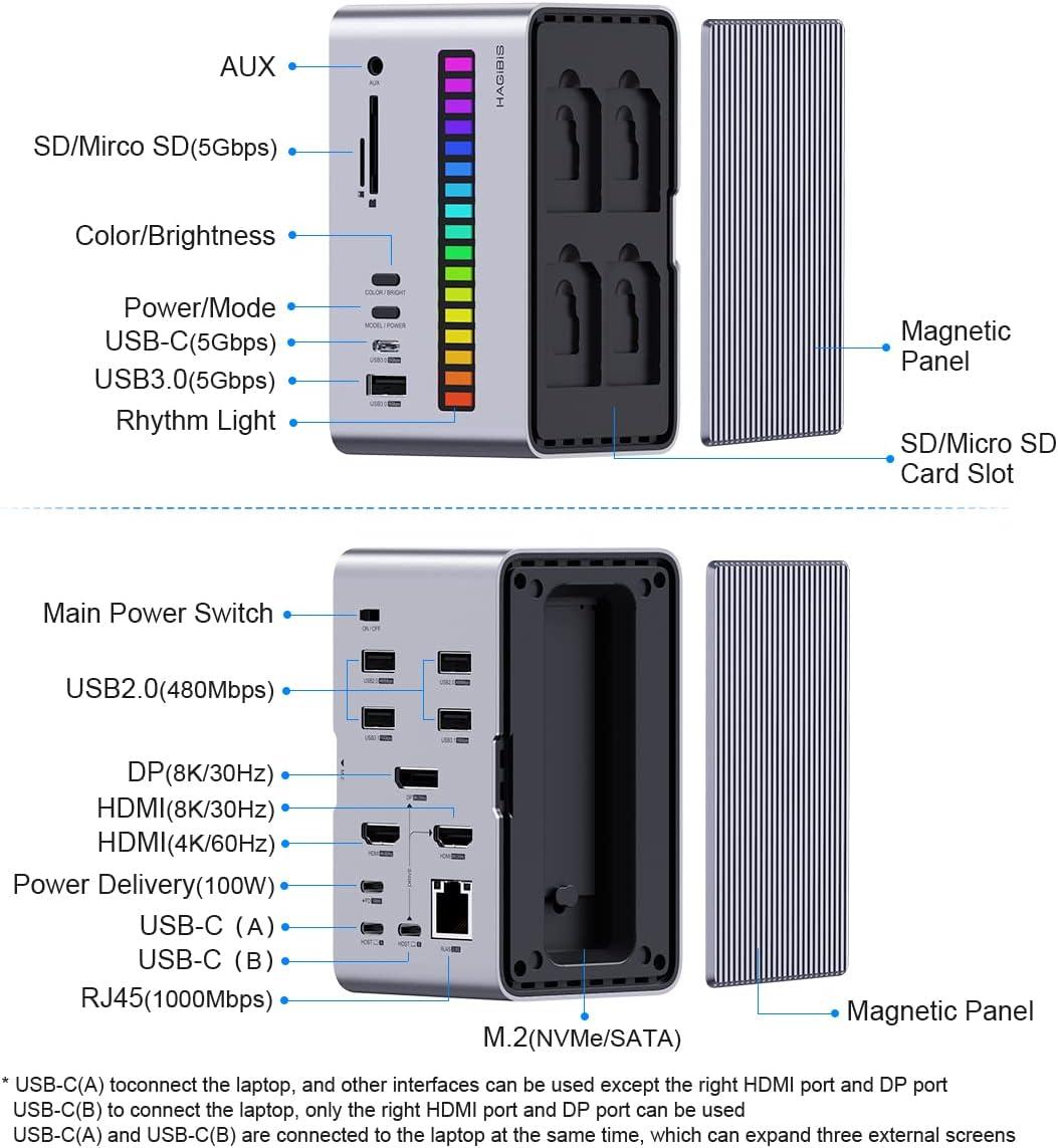 8K@30Hz Multi-Screen Entension: External 3 monitors at the same time, support Mirror Mode and Extended Mode. USB-C(A) is the main dock interface, can control all the interfaces except the right DP and HDMI ports. USB-C(B) can only control the right DP and HDMI ports. *Tip: Apple M1 chip and M2 chip does not support Multi-Screen, can only expand to one external screen, but M1 Pro and M1 Max chips are not limited